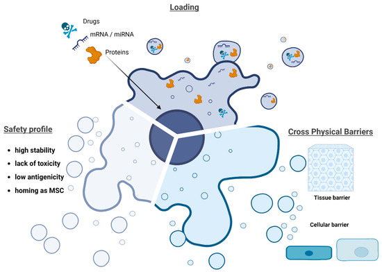 MSCs display differentiation, proliferation, immunomodulatory, and trophic properties, which have been harnessed in clinical applications [21]. Recently, it has been proposed that MSCs might exert their therapeutic effects through paracrine activity, through the secretion of biologically active cargo [22,23]. These active molecules comprise not only soluble factors, but also EVs, which have recently emerged as a cell–cell communication mechanism [23,24,25]. MSC-derived EVs have demonstrated benefits for the management of different pathological conditions. Recently, loading MSC-derived EVs with defined cargos such as miRNAs has been suggested to be a promising strategy for the treatment of different diseases [26]. For these reasons, it was important to describe the potential of MSC-derived EVs as drug delivery systems (DDS) in disease treatment and their advantages.
