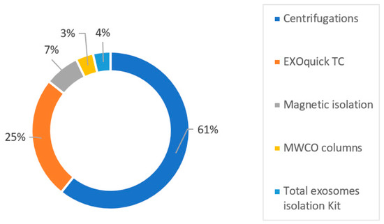 Polymer-based precipitation is another isolation method. The method is based on EV precipitation in polymer solutions, due to changes in EV solubility and aggregation. The reagents used for polymer-based exosome isolation mainly include protamine, acetate, protein organic solvent precipitation (PROSPR), and polyethylene-glycol (PEG). PEG is the most commonly used polymer [74]. Dash et al. suggested that the PEG-based approaches display high stability and good quality [75]. This operation is simple, fast, and suitable for large-volume samples, and it preserves the bioactivity of isolated EVs. However, potential contamination with copurifying protein aggregates or residual polymers isolated with EVs may occur. The EV size is comparable between the UC and precipitation methods. Nevertheless, the EV count is higher with polymer precipitation [76]. Recently, Jia et al. reported that the PEG-based method isolated more EVs, proteins, and RNA than the UC method [77].