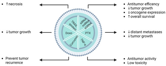 Summary of EV cargos, and their relevant effects on cancerous pathologies in vitro (Doxo: doxorubicin, PTX: paclitaxel, : increase, : decrease).