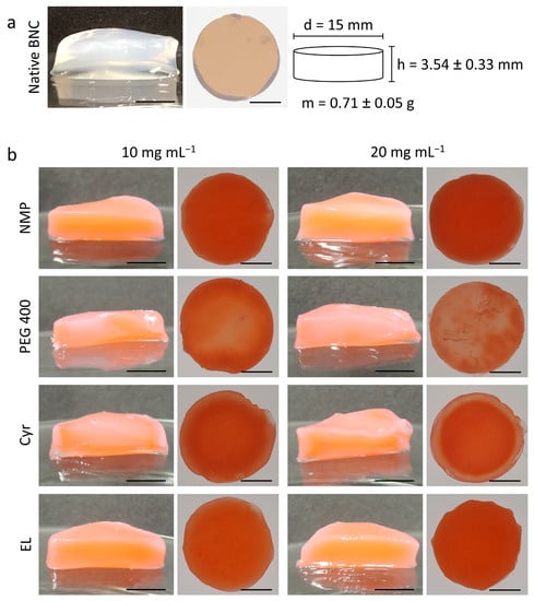 Additionally, the presence of PLGA particles in the BNC could also be indirectly confirmed by spectrophotometric investigation of BNC transparency at 600 nm (Figure 2e). An interference of Sudan III (absorbance maximum 506 nm) could be excluded in preliminary experiments (Figure S1). While native BNC revealed a transmission of 85%, on the other hand, it was reduced to comparable values around 40 to 50% for NMP, EL, and Cyr independent of the PLGA concentration, which indicates the formation of a disperse polymer phase in the BNC network as observed earlier also for nanoemulsions [41]. The inhomogeneous loading observed with PEG 400 as solvent was also represented by the higher transmission with high variability. The best loading results could be obtained by the use of NMP and EL demonstrating (i) fast phase transition, (ii) homogenous loading, and (iii) the ability to incorporate high amounts of polymer.