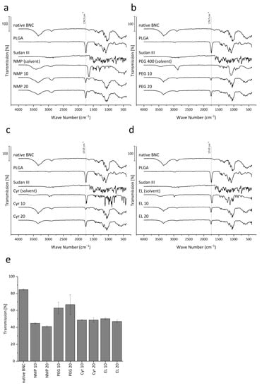 (a–d) ATR-FT-IR spectra of PLGA loaded fleeces in comparison to native BNC, Sudan III, pure PLGA, and the used solvents. Spectra are combined for the respective formulation approaches based on NMP (a), PEG 400 (b), Cyr (c), and EL (d). The marked bands at 1747 cm−1 are related to the stretching of the carbonyl functionality of PLGA. (e) Concentration and solvent-dependent light transmission through native BNC in comparison to PLGA loaded fleeces expressed as percentage transmission at 600 nm from five equally distributed points per fleece using UV/vis spectrophotometry (mean ± SD of six different fleeces from two independent experiments).