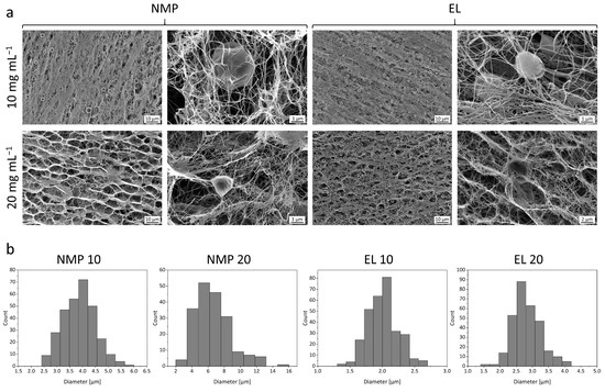 The histograms in Figure 3b allow the comparison of the size distribution of the microparticles obtained by phase inversion, determined as equivalent spherical diameter. Mean particle sizes of 3.87 ± 0.62 µm for NMP 10, 6.63 ± 2.23 µm for NMP 20, 2.01 ± 0.24 µm for EL 10 and 2.82 ± 0.43 µm for EL 20 revealed an increase of size with higher polymer concentrations. An increased tendency for particle nucleation and aggregation up to the uncontrolled formation of a coherent polymer network was suggested to be responsible for this effect as observed earlier by Pircher et al. [51], who investigated the precipitation of different polymers within BNC using supercritical carbon dioxide as a solvent. Particles precipitated from EL solutions were considerably smaller compared to NMP which might be related to the different critical water concentrations for phase inversion. The higher tolerance of NMP-based PLGA solutions for water promotes extended particle growth due to a longer time frame for particle nucleation and aggregation resulting in larger particle diameters. The influence of the critical water concentration for precipitation on the final size distribution was earlier reported for the solvents N,N-dimethylacetamide, N,N-dimethylformamide, and tetrahydrofuran for the nanoprecipitation of polystyrene via dialysis. Higher mean particle sizes were obtained for solvents with higher water tolerance [72].