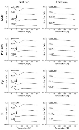 The determination of thermal properties, especially the glass transition temperature, reveals information on polymer crystallinity. DSC measurements investigated the thermal properties and crystallinity of BNC and PLGA alone and in combination with heat flow curves to identify differences resulting from the use of different solvents (Figure 4). In the first run, native BNC demonstrated a wide endothermic peak between approximately 5 and 120 °C related to the evaporation of residual water. The third run revealed the high thermal stability of BNC without noticeable signals up to 250 °C, which is in agreement with prior reports of decomposition temperatures about 290 °C [73] to 330 °C [74]. PLGA exhibited a sharp endothermic peak at 50 °C in the first run related to the melting of the polymer, comparable to earlier results [64]. This indicates the presence of crystalline regions within the PLGA microparticles. However, due to an overlap of the signal with that of the evaporating water, it was not possible to analyze phase transition enthalpy or degree of crystallinity. The glass transition temperature could be detected in the third run with a value of 38 °C. No shift of the glass transition temperature could be observed when using NMP and EL, which indicates that PLGA did not hydrolyze during the formulation procedure as a decreasing molecular weight would lead to lower glass transition temperatures [75]. While fleeces treated with Cyr showed similar characteristics, the particles obtained by precipitation from PEG 400 showed no melting point and a glass transition temperature shifted to lower temperatures between 25 and 30 °C. The signals are weak compared to the other solvents presumably because of the low amount of incorporated polymer, nevertheless, the results are plausible since PEG 400 is known to act as a plasticizer for PLGA [76].