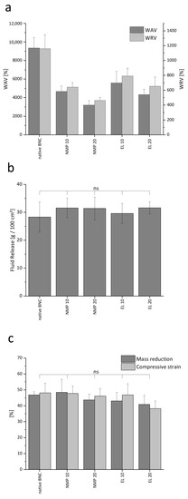Comparison of the physicochemical characteristics of native BNC and PLGA loaded fleeces with (a) WAV and WRV, (b) fluid release, and (c) compression stability (mean ± SD of six different fleeces from two independent experiments, ns marks non-significant differences compared to native BNC with p > 0.05).