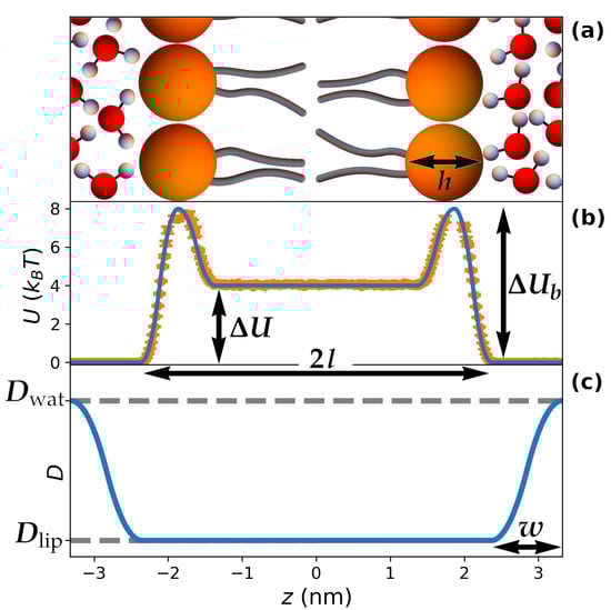 Finally, the parameter w was set in accordance with experimental evidence and molecular dynamics simulations, which point to the existence of 3–4 layers of water with reduced mobility in proximity of the lipid heads [8,40,44]. The specific value of this thickness was selected to be nm (Figure 1c), in order to ensure that is reached exactly at , thus avoiding a discontinuity in the derivative of , which would have occurred for larger values of w.