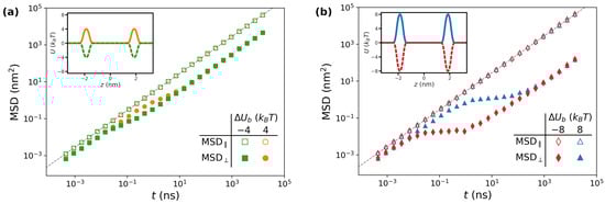 The simulation setup enables devising systems which, albeit unrealistic, provide clear insights on the impact of each feature taken separately. In this section, we focus on how the barrier affects large-scale diffusion. To this aim, we thus fix and nm2/ns, so as to isolate the effect of alone. Examples of potentials are reported in the insets of Figure 2. In the figure, the main plots show the mean-square displacement (MSD) for selected values of , in order to highlight the role played by the magnitude and sign of this parameter. Particularly, in Figure 2a, we show the MSD for (green squares) and (orange circles). The empty symbols correspond to the MSD computed along planes parallel to the lipid/water interface, MSD‖. Since in the considered systems the diffusion coefficient is constant throughout space, lateral diffusion is unaffected by the value of . Therefore, MSD‖ shows a standard diffusive behavior characterized by a diffusion coefficient , i.e., MSD‖ (grey dashed line in Figure 2a). In a log-log plot such as the ones considered in the figure, this corresponds to a linear function with slope one shifted according to the value of .