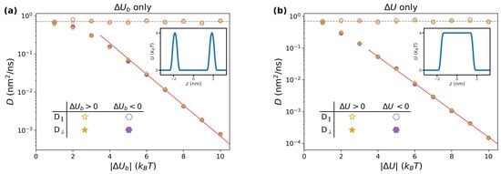 In Figure 3a, we report the long-time diffusion coefficients obtained by varying the magnitude of in the range , for both positive (purple hexagons) and negative (golden stars) values of the barrier. Coherently with Figure 2, the lateral diffusion coefficients (empty symbols) are independent of the height of the barrier, and correspond to the value of (grey dashed line). On the other hand, the perpendicular diffusion coefficients (filled symbols) are strongly affected by , displaying an exponential decay starting from , for which a two-parameters best fit yields (red continuous line). This can be rationalized by observing that, for large values of , jumping events from one side of the barrier to the other are rare. The rate k at which these events take place is approximately captured by the Arrhenius equation, . At time t (assumed to be large enough for the system to be found in the long-time diffusing regime), the cumulate number of expected events is . Each jump corresponds to a certain length within the same order of magnitude of the lattice parameter a. The total distance L travelled by the random set of jumps thus satisfies the relation . Since one has also , one thus obtains . Note that the Arrhenius formula predicts a prefactor equal to in the exponent, which is in good agreement with the best-fitting value. Finally, the results obtained for and fall on the same master curve, confirming the trend observed in the long-time regime of in Figure 2.