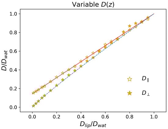 As for the perpendicular direction, from Figure 4, one finds that is systematically lower than . The simulation results can be rationalized by considering the two extreme cases. When , one retrieves the diffusion coefficient obtained in the trivial case , i.e., due to the absence of an external potential. In contrast, for , one expects that the particles are effectively confined along the perpendicular direction, i.e., that they do not diffuse transversally to the lipid/water interface. Indeed, in order to increase , they need to traverse the full periodic repeat of the system; however, within the lipid region, there is practically no diffusion, so that the particle will need a large amount of time to cross it. In other terms, one expects in this limit that the transition to the long-time regime (see, e.g., Figure 2) moves towards larger and larger times, thus resulting in a vanishing value of . Note that this reasoning does not apply to , since there is no need for the system to cross the lipid phase in order to increase . Quantitatively, we found that a good description of the data is obtained by means of a power law , which provides the correct limiting behavior and is reported as a blue dashed line in Figure 4.