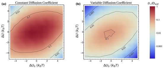 Dependence of the perpendicular long-time diffusion coefficient on hydropathy () and affinity for lipid heads (), implemented according to the corresponding potential of mean force (Figure 1a); (a) is obtained by assuming , while (b) considers a more realistic diffusion profile with (Figure 1c). The contours correspond to the indicated values of .