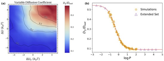 As for the lateral diffusion coefficient , in the simulations of Set 1, one finds trivially that , analogous to what was reported in Figure 3. The results obtained for Set 2 are instead reported in Figure 6a. In this case, the largest values are obtained for with a large magnitude, i.e., by maximizing the depletion from the lipid phase. This can be understood by observing that, to achieve an efficient lateral diffusion, one does not need the particles to cross a full periodicity, but rather to maximize the time spent in the water phase, characterized by a larger mobility (Figure 1c). This is best achieved by increasing the energy penalty for particle localization in the lipid phase, i.e., by large, positive values of and (Figure 1b). Quantitatively, as discussed above, the absence of a direct drift term in the parallel direction suggests that can be identified with the average . Hence, in the presence of a potential , one can generalize Equation (12) as