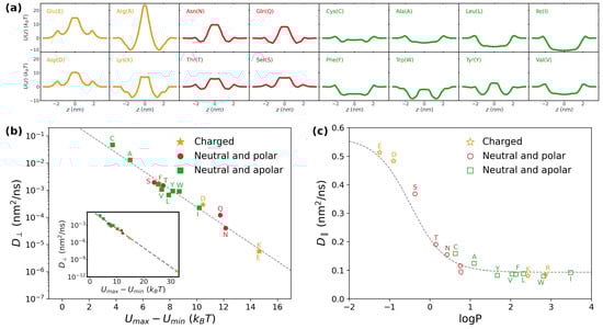 (a) Potential of mean force for 16 amino acids as computed in Ref. [63]. The plots were colour-coded according to the physico-chemical properties of the side chain: gold ↔ charged, red ↔ polar and green ↔ apolar; (b) perpendicular diffusion coefficient for charged (filled gold stars), polar (filled red circles) and apolar (filled green squares) residues as a function of the difference between maximum and minimum height of the corresponding potential of mean force. In the inset, the full range of is considered to include the case of Arg, for which . The dashed grey line is a best fit via an exponential decay; (c) parallel diffusion coefficient for charged (empty gold stars), polar (empty red circles) and apolar (empty green squares) residues as a function of the logarithm of the partition coefficient . The dashed grey line corresponds to the theoretical prediction according to Equation (14).