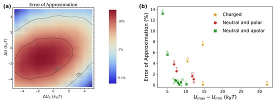Remarkably, Equation (15) enables estimating the macroscopic diffusion coefficient from knowledge of local geometrical () and transport () properties, as well as from the overall thermodynamic equilibrium distribution (). In Figure 8, we test the accuracy of Equation (15) by comparing its prediction with the value obtained directly from the simulations, both for the toy model (panel a) and for the amino-acids’ simulations (panel b). For barriers larger than , the prediction gives values within 10% of the numerical ones. Nevertheless, it should be kept in mind that the threshold value of the barrier for which the approximation works reasonably is expected to depend on the numerical values chosen for the parameters, particularly for the ratio .