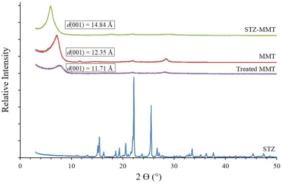 The powder XRD patterns of the raw components and the STZ-MMT IP are shown in Figure 2 and a larger view of the graphs is shown in Supplementary Materials (Figure S1). The STZ showed three intense reflections: an intense reflection at around 15.5°, 22°, and 25° 2, corroborating those previously reported [41]. In the diffractogram of the oriented aggregates of the IP, a peak (001) similar to the pristine montmorillonite (MMT) is observed, although shifted to higher d-spacing values. This indicates that the interlayer space has increased due to the adsorption of sulfathiazole, corroborating that the drug is present in the IP and its intercalation in the clay. After the interaction of STZ with the MMT, there is a complete absence of drug reflections, which is probably due to a loss of the crystallinity of the STZ. The proportion of the drug in the IP is five times lower than that of the clay and the peaks can be slightly masked, even though STZ is present. In addition, the same IP preparation procedure was performed for the montmorillonite without STZ to corroborate that the increase in the basal spacing of the clay is due to only the drug adsorption and not to the effect of the IP treatment with montmorillonite. In the diffractogram of this sample of montmorillonite, after following the IP preparation procedure without the drug (treated MMT), the interlayer space does not increase, it even seems that there is a tendency to decrease slightly with respect to the untreated MMT, possibly due to a lower water amount (Figure 2).