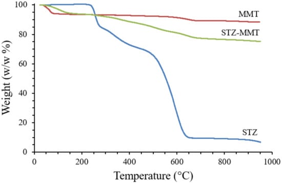 The thermogravimetric analysis profile (Figure 3, and Supplementary Materials Figure S2) shows the weight loss (w/w%) of the different samples studied. The drug degrades in a specific temperature range. A weight loss of the STZ is shown in the range 250–950 °C (93.7% w/w), where the maximum loss is observed at 640 °C, in accordance with that previously reported [42]. In the MMT, a weight loss of approximately 10% is observed, according to previous studies [15], along with an additional weight loss at 600–700 °C, corresponding to the water formed in the dehydroxylation process of the MMT [43]. The thermal decomposition of the drug is also observed in the weight loss of STZ-MMT in the range 250–950 °C, confirming that the drug is present in the IP and adsorbed on the montmorillonite.