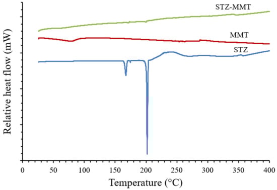 The thermal study was completed by also performing a differential scanning calorimetric (DSC) analysis of the samples studied (Figure 4, and Supplementary Materials Figure S3). The DSC profile for the STZ shows a strong endothermic peak at 202 °C, corresponding to the melting point of the drug, which is between approximately 200–203 °C, and two earlier milder peaks at 168 °C and 175 °C, which were also reported previously [44]. At a higher temperature, an exothermic broad peak is observed due to the thermal decomposition of STZ, with weight loss observed above, in the TGA. The MMT showed an endothermic peak around 80 °C, corresponding to the evaporation of the water. As a result of the drug-clay interaction, the DSC curve of the STZ-MMT showed very low intensity peaks of the drug, appearing first as a melting peak at 172 °C, and second at 200 °C. These results show the loss of crystallinity and amorphization of the drug, which may indicate an increase in the solubility of the STZ after its interaction with the clay.