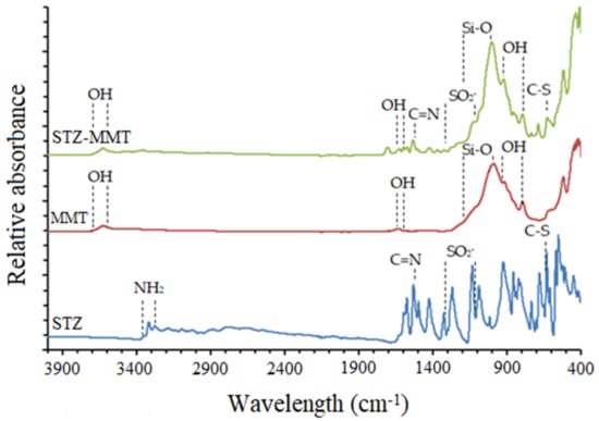 FTIR spectra of STZ, MMT and STZ-MMT, showing the characteristic bands of the samples.