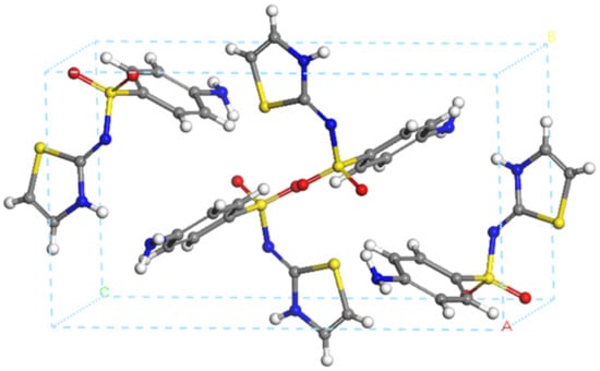 Crystal structure of sulfathiazole. Hydrogen, oxygen, nitrogen, sulfur, and carbon atoms are represented by the colors white, red, blue, yellow, and gray, respectively. A, B, C is X, Y, Z axis, respectively.