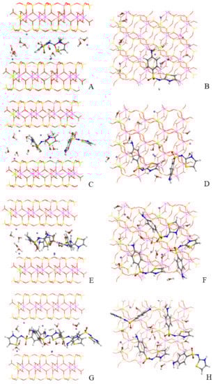 Optimized intercalation models of MMT with one (A,B), two (C,D), three (E,F), and four (G,H) STZ molecules per supercell, respectively. Views from (010) (A,C,E,G) and (001) (B,D,F,H) planes. Silicon atoms are represented in yellow, oxygen in red, aluminum in pink, magnesium in green, hydrogen in white, and sodium atoms in bluish-purple.