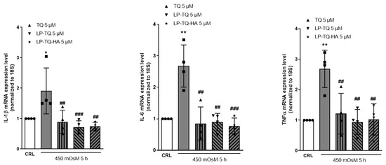 The mRNA levels of IL-1β, Il-6 and TNFα in HCE-2 cells exposed to hyperosmotic media and treated with TQ, LP-TQ and PL-TQ-HA. Dot blots show the results of four experiments. * p < 0.05 and ** p < 0.01 vs. CRL; ## p < 0.01 and ### p < 0.01 vs. hyperosmolarity (ANOVA + Tukey’s w-test).