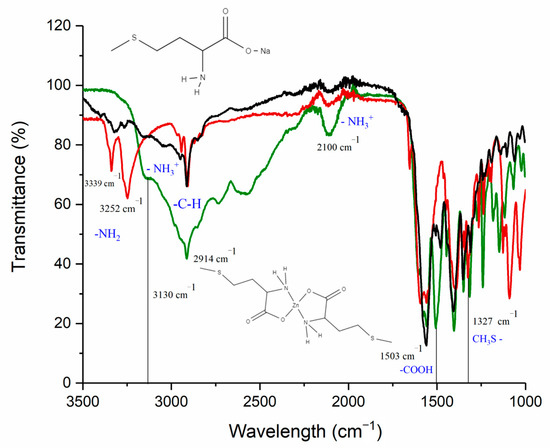 ATR-IR spectra of L-methionine (green), sodium methionine (black) and synthesized zinc methionine complex (red).