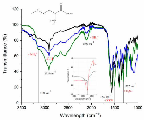 The IR spectrum of L-methionine, sodium methioninate, and the crystallized zinc methioninate complex Zn(Met)2(SO4)x·nH2O are shown in Figure 4. The IR spectrum of the crystallized complex also retains the CH3S- group oscillation-band at 1327 cm−1, besides there is no absorption band at 1503 cm−1, which corresponds to the carboxyl group (-COOH). However, two bands of the coordinated amino group (3339, 3252 cm−1) are very weakly expressed on the IR spectrum of the crystallized complex, which is more noticeable on the difference spectrum (Figure 4, insert). Thus, the formation of the covalent-polar bond O-Zn between the metal and the amino acid residue is strongly pronounced on the obtained IR spectrum and the fluctuations of the donor-acceptor bond N→Zn are much weaker. The absorption bands at 3130 and 2100 cm−1 are present on the L-methionine spectrum which indicates protonation of the amino group. Similar fluctuations were also observed in the IR spectrum of crystallized zinc methioninate Zn(Met)2(SO4)x·nH2O that may reveal the presence of free methionine in the sample, i.e., the formation of zinc chelate complex in the stoichiometric ratio Zn: Met ≠ 1:2. In addition, the absence of significant absorption bands in the frequency range above 3450 cm−1 means the absence of oscillations of the O-H bond, and, consequently, crystallization water molecules. Thus, the composition of the crystallized complex can be described by an adjusted formula without a crystalline hydrate water—Zn(Met)2(SO4)x.