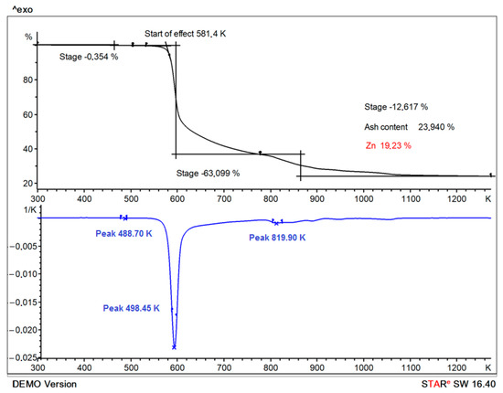 The analysis of TGA/DTA results shows a decrease in the mass of the sample Zn(Met)2 by 0.35% at 488.69 K; the mass loss is due to an unidentified component, but probably not water [24]. The decomposition of synthesized Zn(Met)2 was recorded in the temperature range from 581.4 to 1073 K (Figure 6). Two different mass losses were observed in the TGA/DTA diagram with maximum decomposition rates at 598.44 and 820.04 K. Step one and step two mass losses were about 63.10% and 12.62%, respectively. The first step occurred in the range of 573 to 673 K and may be related to losing the carboxyl group into CO2. The second step from 783 to 1073 K is due to the loss of NH2 group and sulfur moiety in the complex [20,24]. According to the TGA analysis results, the zinc content in the synthesized chelate complex is 19.23%, while the calculated Zn content for the complex described by formula Zn(Met)2 is 18.07%.