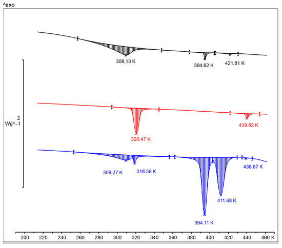 DSC thermogram of L-Methionine (black), synthesized Zn(Met)2 (red) and crystallized Zn(Met)2(SO4)x (blue) complexes during the first heating of samples.