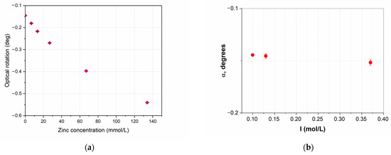 Optical activity of methionine and zinc sulfate solutions during the complexation reaction at pH 5.74 under conditions of increasing concentration of the complexing agent. The error bars represent the standard deviation of measurements (n = 5) (a). Control of ionic strength influence on the optical activity of methionine solution (134 mmol/L) without added zinc (b).