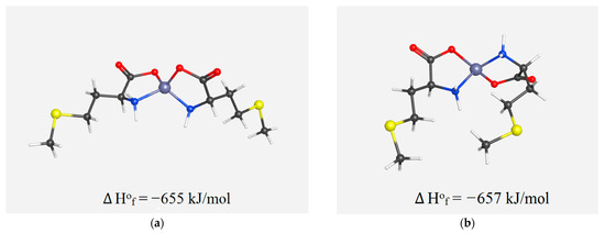We assume the possibility of the formation in the solution of two isomeric forms of the chelate complex Zn(Met)2(SO4)x—cis- and trans-, whose spatial structures, excluding water molecules and sulfate anions, are shown in Figure 10 [44]. The calculated values of the formation enthalpy may indicate the simultaneous existence in a solution of both forms of chelate complexes cis- and trans- Zn(Met)2(SO4)x in an equivalent amount.