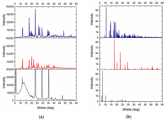 Obtained XRD pattern of synthesized Zn(Met)2 (red) and crystallized Zn(Met)2(SO4)x (blue) complexes and recrystallized L-Methionine (gray) (a) and corresponding simulated XRD patterns (b).
