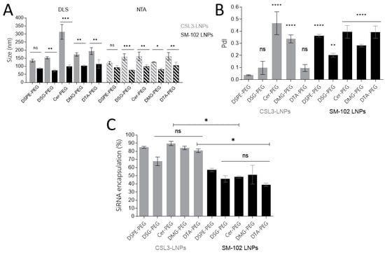Finally, no impact of the lipid-PEG was observed on the siRNA encapsulation level when CSL3 and SM-102/DSPE-PEG were taken as control and compared with the other formulations of the corresponding group (Figure 2D). Similar high levels of siRNA encapsulation (~80%) were observed for all of the CSL3 formulations, as previously measured [11] (Figure 2D), but lower encapsulation efficiencies were measured for SM-102 LNPs with ~50% of encapsulated siRNA. Moreover, statistical analysis confirmed that the SM-102 formulations including Cer- and DTA-PEG showed significantly lower levels of siRNA encapsulation when compared with the corresponding CSL3 formulations.