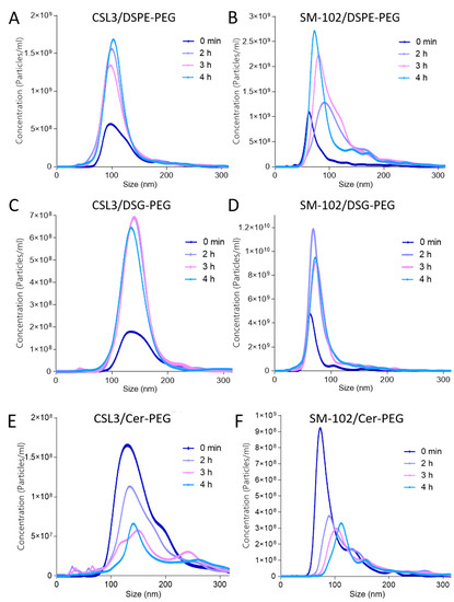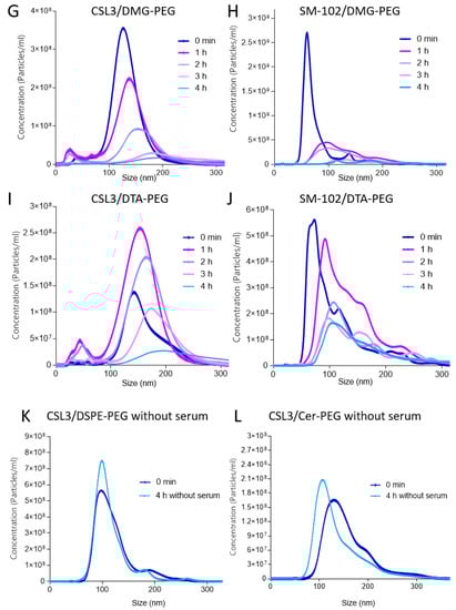 Particles’ distribution profiles (concentration–size curves) given by the NTA during LNPs’ incubation at 37 °C in serum over time (from 0 min to 4 h) (A) CSL3/DSPE-PEG LNPs, (B) SM-102/DSPE-PEG LNPs, (C) CSL3/DSG-PEG LNPs, (D) SM-102/DSG-PEG LNPs, (E) CSL3/Cer-PEG LNPs, (F) SM-102/Cer-PEG LNPs, (G) CSL3/DMG-PEG LNPs, (H) SM-102/DMG-PEG LNPs, (I) CSL3/DTA-PEG LNPs, (J) SM-102/DTA-PEG LNPs, (K) CSL3/DSPE-PEG LNPs (0 min and 4 h) in water without serum, (L) CSL3/Cer-PEG LNPs (0 min and 4 h) in water without serum.