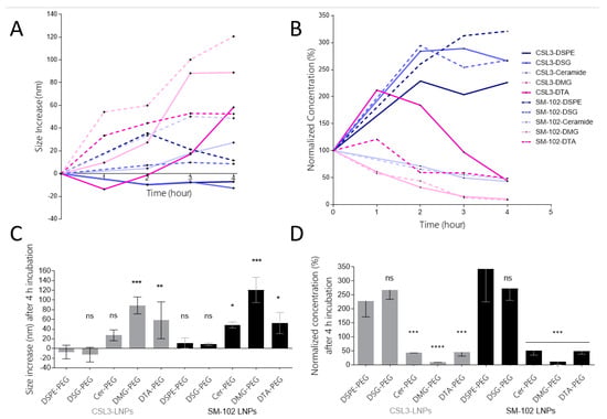 In contrast, the DSPE- and DSG-PEG formulations (C18) did not show flattened curves, as presented in Figure 3A–D. These formulations were characterized by the maintenance of a similar average size during incubation (size increase below 12 nm after 4 h of incubation) and the absence of a decrease in concentration. A surprising increase in the concentration was even observed, which could be related to the free serum particles being included in the total count, as they are not adsorbed around the LNPs. This confirmed the good protection against proteins’ interactions provided by C18 lipids-PEG. Intermediate results were obtained for the Cer-PEG formulations. The mean size increase fell between that observed with the C14 lipids-PEG and the C18 lipids-PEG formulations (27 nm and 49 nm for the CSL3 and SM-102/Cer-PEG formulations, respectively, after 4 h). This increase in the mean size was significant for SM-102/Cer-PEG LNPs but not for CSL3/Cer-PEG LNPs. Moreover, a significant decrease in the normalized concentration was observed for both formulations.