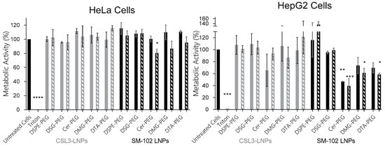 In order to evaluate the safety of the tested LNPs, two different human cancer cell lines were used: HeLa and HepG2 cells. HepG2 hepatic cells were used considering the potential hepatic specificity of LNPs covered by a protein corona. Moreover, this cell line is commonly used for hepatotoxicity studies [22]. The metabolic activity study was performed without and with serum (10% FBS) after 24 h of transfection. Data are shown in Figure 5 and were analyzed following several parameters. In serum-free medium (filled bars) and as compared to untreated cells (Dunnett test, Figure 5), the lipid-PEG has no significant impact on the metabolic activity of Hela cells and HepG2 cells, except for SM-102/Cer-PEG LNPs for HepG2 cells. In serum (patterned bars), only one formulation significantly decreased the metabolic activity of HeLa cells (SM-102/Cer-PEG LNPs), while three formulations significantly decreased the metabolic activity of HepG2 cells (SM-102/Cer-, /DMG- and /DTA-PEG LNPs). It was therefore concluded that there was a potential toxicity of C14 lipids-PEG LNPs, mainly in HepG2 cells and in serum. Regarding the impact of the ionizable lipids, the data were compared (Tukey test) between CSL3 and SM-102 formulations including the same lipid-PEG. In serum-free medium, LNPs showed no impact from the ionizable lipid on metabolic activity, while in serum medium, the SM-102/Cer- (*) and /DTA-PEG LNPs (**) showed a significant decrease in metabolic activity compared to the corresponding CSL3/Cer- and /DTA-PEG LNPs, but only for HepG2 cells. These results could also be related to the higher amount of SM-102 LNPs used to transfect cells at a constant concentration of 100 nM siRNA considering that the percentage of siRNA encapsulation was found to be significantly lower for SM-102/Cer- and /DTA-PEG LNPs. Transfection in serum-containing medium seemed to highlight the potential toxicity of the mentioned LNPs.