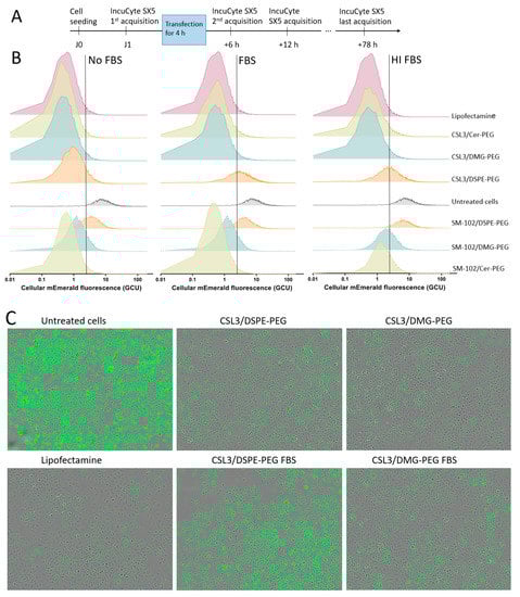 (A) Schematic protocol for transfection and image acquisition. (B) Frequency distribution of the cellular mEmerald fluorescence intensities (GCU) of MDA-MB-231 cells transfected with CSL3 and SM-102 LNPs, including DSPE-, DMG- and Cer-PEG, in serum-free medium, FBS- or HI FBS-containing media, 72 h after transfection. Untreated- and Lipofectamine-treated cells were used as negative and positive controls, respectively. The vertical lines point to the minimum fluorescence intensity measured in untreated cells. (C) Representative composite phase contrast and fluorescent pictures of MDA-MB-231 cells expressing mEmerald and transfected with CSL3 LNPs including DSPE- and DMG-PEG in serum-free or FBS-containing medium, 72 h after transfection.