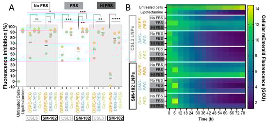 (A) mEmerald fluorescence inhibition of MDA-MB-231 cells transfected with CSL3 and SM-102 LNPs, including DSPE-, DMG- and Cer-PEG, in serum-free, FBS- or HI FBS-containing media 72 h after transfection. The mean fluorescence intensity of all of the cells of each condition were collected, and median values were calculated, normalized (%) to the control (untreated cells) and transformed in order to obtain the percentage of fluorescence inhibition. Each dot represents the result of one independent experiment (color-coded for experiments), and the horizontal bars represent the mean of three experiments. Statistical analyses were performed by two-way ANOVA followed by the Tukey test. (B) Heatmap showing the kinetic evolution of the mean fluorescence intensity (GCU) of MDA-MB-231 cells transfected with CSL3 and SM-102 LNPs including DSPE-, DMG- and Cer-PEG, over time in serum-free, FBS- or HI FBS-containing media. Each value represents the mean of three independent experiments (n = 3). The difference between groups was considered significant when the p-value was <0.05 (*), <0.01 (**), <0.001 (***) or <0.0001 (****).