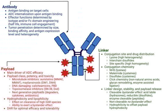 ADCs are made up of the antibody (blue), the payload (red), and the chemical conjugation (green) that brings them together. Functions and the most critical design considerations for each component have been listed. Created with BioRender.com.
