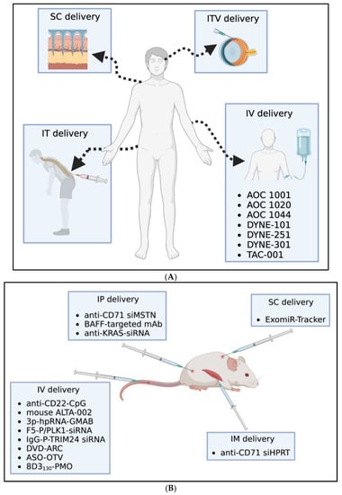 Oligonucleotide therapeutics represent a very promising strategy for targets previously thought to be unattainable. By mimicking short RNA, oligonucleotides are able to act at the genetic level, thus blocking production of unwanted proteins before it begins. Moreover, oligonucleotides can also be designed to selectively target altered splicing patterns, which has opened up the possibility for therapeutics with exquisite selectivity [44]. Although oligonucleotides have been around for many years already and despite promising clinical developments with antisense oligonucleotide (ASO) [44,45], phosphorodiamidate morpholino oligonucleotide (PMO) [46], and small interfering RNA (siRNA) molecules [47], concerns have remained regarding poor PK and biodistribution profiles. Nonetheless, recent medicinal chemistry advances, along with expansion of oligonucleotide formats, have renewed the excitement in their potential once again [48,49,50]. Because an intravenously dosed oligonucleotide must overcome numerous biological barriers in order to reach its intracellular target, it is not surprising that many of the clinically advanced or approved oligonucleotides are either leveraging alternative administration routes such as subcutaneous (SC), intrathecal (IT), and intravitreal (ITV) injection [50] or are being paired with a delivery strategy for intravenous delivery (IV) (Figure 2A) [51,52,53]. Thus, more recently, the focus of oligonucleotide development has expanded to include therapeutic delivery, in addition to oligonucleotide design considerations.