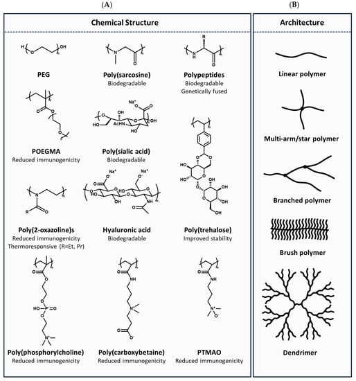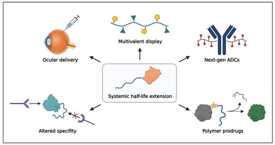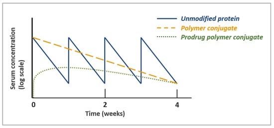 Proteins and peptides have played a foundational role in the treatment of diseases for nearly a century, beginning with the first commercial use of insulin in 1923. Early protein-based therapeutics, developed prior to the introduction of recombinant DNA technology, were limited by their immunogenicity. The use of chemical conjugation to enhance the properties of proteins dates back to at least the 1970s, when Frank Davis hypothesized that conjugation of a hydrophilic polymer such as PEG could reduce the immunogenicity of non-native proteins and unexpectedly discovered that PEGylation improved the circulating half-life of proteins as well [1,2,3,4]. Since then, at least 30 polymer–protein and polymer–peptide conjugates have been approved by the FDA [5], each of which use polymer conjugation to improve their pharmacokinetics and shield them from antidrug antibody recognition. In addition, the 50-year span of research into the properties of polymer conjugates has unveiled many new properties in this class of therapeutics that have expanded both their prevalence and mechanisms of action in the clinical space.