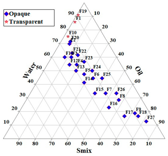 Based on the results of the solubility studies, the selected oil (LMCS), surfactant (T80), co-surfactant (TP), and water were used to construct the p-TPD. In this case, the Smix was a blend of T80 and TPS. The ratio of the oil phase to the Smix was changed from 1:9 to 1:1, and the Smix was created using water as the aqueous polar/continuous phase. A total of 27 formulation prototypes (F1-27) were prepared. P-TPD was plotted by keeping LMCS, Smix, and water at three different vertices of a triangle, and the observations were in terms of opaqueness and transparency, indicating the formation of the ME or macroemulsion. Todd Thompson Triplot software was used for plotting the p-TPD. Based on the transparent area found in the diagram, the concentration range of solubilizers was further selected to apply DoE [28].
