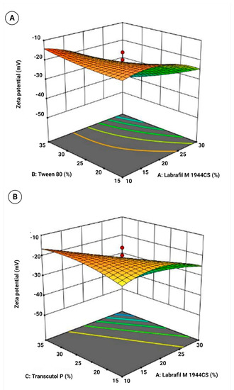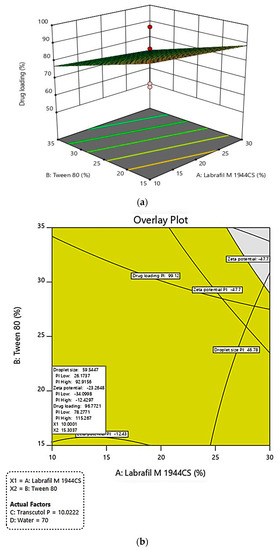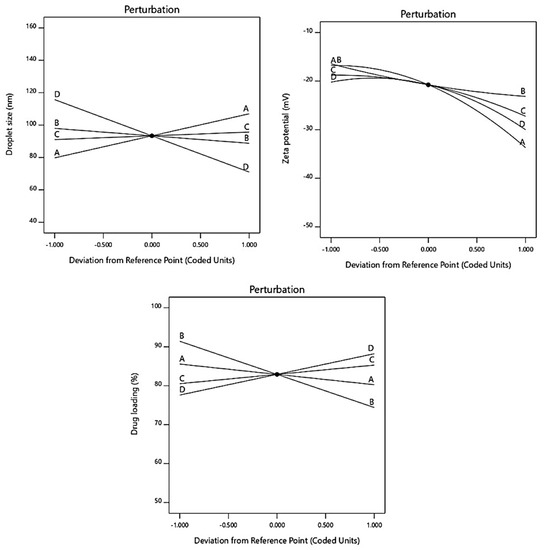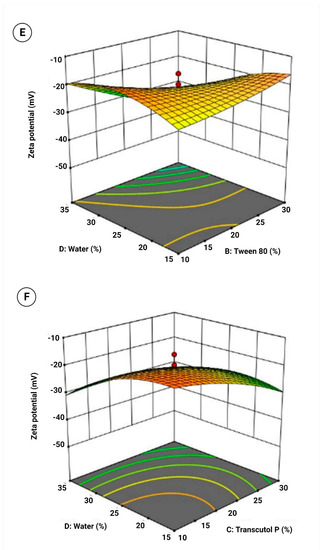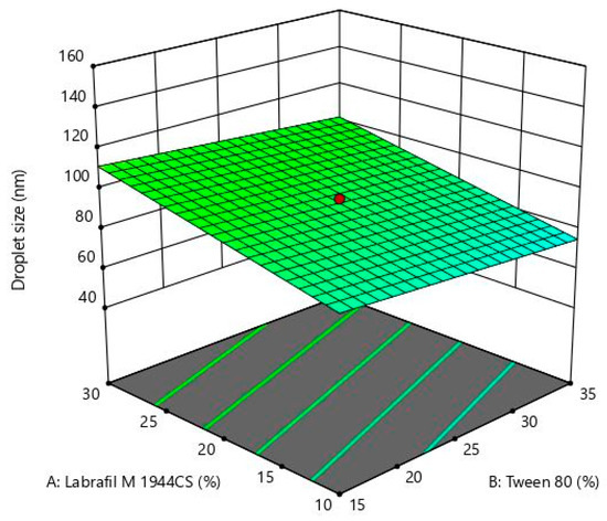 In the equation, the positive sign before factors indicates the synergistic effect of that factor on the response, whereas the negative sign indicates the antagonistic effect of that factor against that response [41]. In the case of droplet size, it was observed that LMCS, T80, and water have an antagonistic effect on droplet size, whereas TP has a synergistic effect on droplet size. This revealed that LMCS and T80 were important in lowering the emulsion droplet size. This negative effect could be due to the fact that SLM showed good solubility in LMCS and Tween 80. Furthermore, they were found more helpful in breaking the intermolecular forces of SLM, which would have helped in the reduction of their droplet size. In the case of zeta potential, all factors helped in increasing the negative zeta potential of the formulation. In the case of drug loading, TP helped in increasing the drug loading. TP played a multifaceted role in the optimization of the formulation by providing good repulsive forces between droplets by creating a high zeta potential. In addition, it also offered good solubility to SLM. Perturbation plots for responses are represented in Figure 3. The bend curves indicate the intensity of the impact of that variable on the response. In all responses, all factors showed sharp bends indicating their significant effect on the responses. The polynomial equation also helped in the generation of 3D response surface plots that further showed similar observations as indicated by the polynomial equation. The images are shown in Figure 4, Figure 5 and Figure 6a.