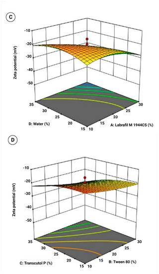 After the selection of the microemulsion region, the level of oil, Smix, and water was optimized using the design of the experiment. By altering independent factors, such as oil content, surfactant and co-surfactant concentration, and water, a central composite design (CCD) was employed to optimize the formula composition. It assisted in determining the major effects, interactions, and quadratic effects of various formulation constituents on droplet dimension, zeta potential, and drug loading. Design-Expert® software was used to conduct the study [27]. Based on the results of p-TPD, LMCS was varied in the range of 10–30% v/v, T80 in the range of 15–35% v/v, TP in the range of 10–20% v/v, and water in the range of 30–70% v/v, (Table 1).