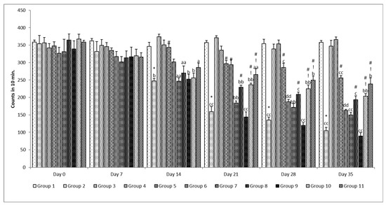 Effect of various treatments on locomotor activity. Note, *, #, and ! represents p < 0.05 vs. group 1, 2, 5, 6, 7, 8, 9 and 10. a, b, c, aa, bb, cc and dd represent p < 0.05 and p < 0.001 vs. day 0, 7, 14, 21 and 28 respectively.