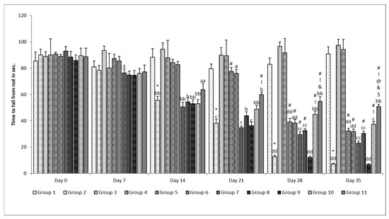 Effect of various treatments on muscle coordination. Note, *, #, @, $, &, and ! represents p < 0.05 vs. group 1, 2, 5, 6, 7, 8, 9 and 10. a, b, c, d and aa, bb, cc and dd represent p < 0.05 and p < 0.001 vs. day 0, 7, 14, 21 and 28 respectively.
