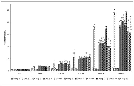 Effect of various treatments on catalepsy in rats. Note, *, #, @, $, ^, &, and ! represents p < 0.05 vs. group 1, 2, 5, 6, 7, 8, 9 and 10. a, e and aa, cc, dd and ee represents p < 0.05 and p < 0.001 vs. day 0, 7, 14, 21 and 28 respectively.