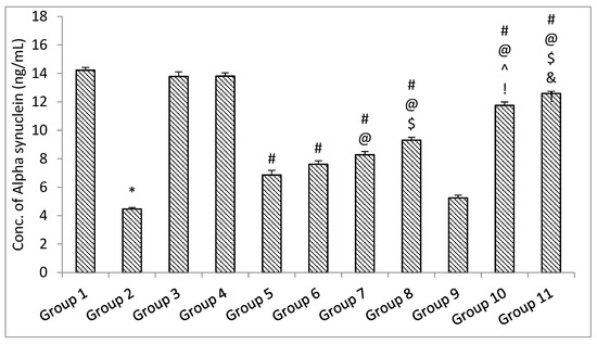 The impact of different treatments on Alfa Synuclein. Data represented as mean ± S.E.M. Note: Data represented as mean ± S.E.M. *, #, @, $, ^, & and ! represent p < 0.05 vs. group 1, 2, 5, 6, 7, 8, 9 and 10 respectively.