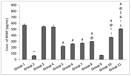 The impact of different treatments on brain-derived neurotropic factor (BDNF). Data represented as mean ± S.E.M. Note: Data represented as mean ± S.E.M. *, #, @, $, ^, &, ! and λ represent p < 0.05 vs. group 1, 2, 5, 6, 7, 8, 9 and 10 respectively.