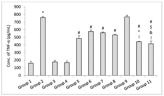 The impact of different treatments on TNF-α. Data represented as mean ± S.E.M. Data represented as mean ± S.E.M. Note: Data represented as mean ± S.E.M. *, #, $, ^, &, and ! represent p < 0.05 vs. group 1, 2, 5, 6, 7, 8, 9 and 10 respectively.