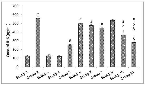 The impact of different treatments on IL-6. Data represented as mean ± S.E.M. Note: Data represented as mean ± S.E.M. *, #, $, ^, &, ! and λ represent p < 0.05 vs. group 1, 2, 5, 6, 7, 8, 9 and 10 respectively.