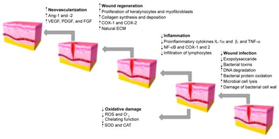 Stages of wound healing. Adapted from Hajialyani, M.; Tewari, D.; Sobarzo-Sánchez, E.; Nabavi, S.M.; Farzaei, M.H.; Abdollahi, M. Natural Product-Based Nanomedicines for Wound Healing Purposes: Therapeutic Targets and Drug Delivery Systems [].